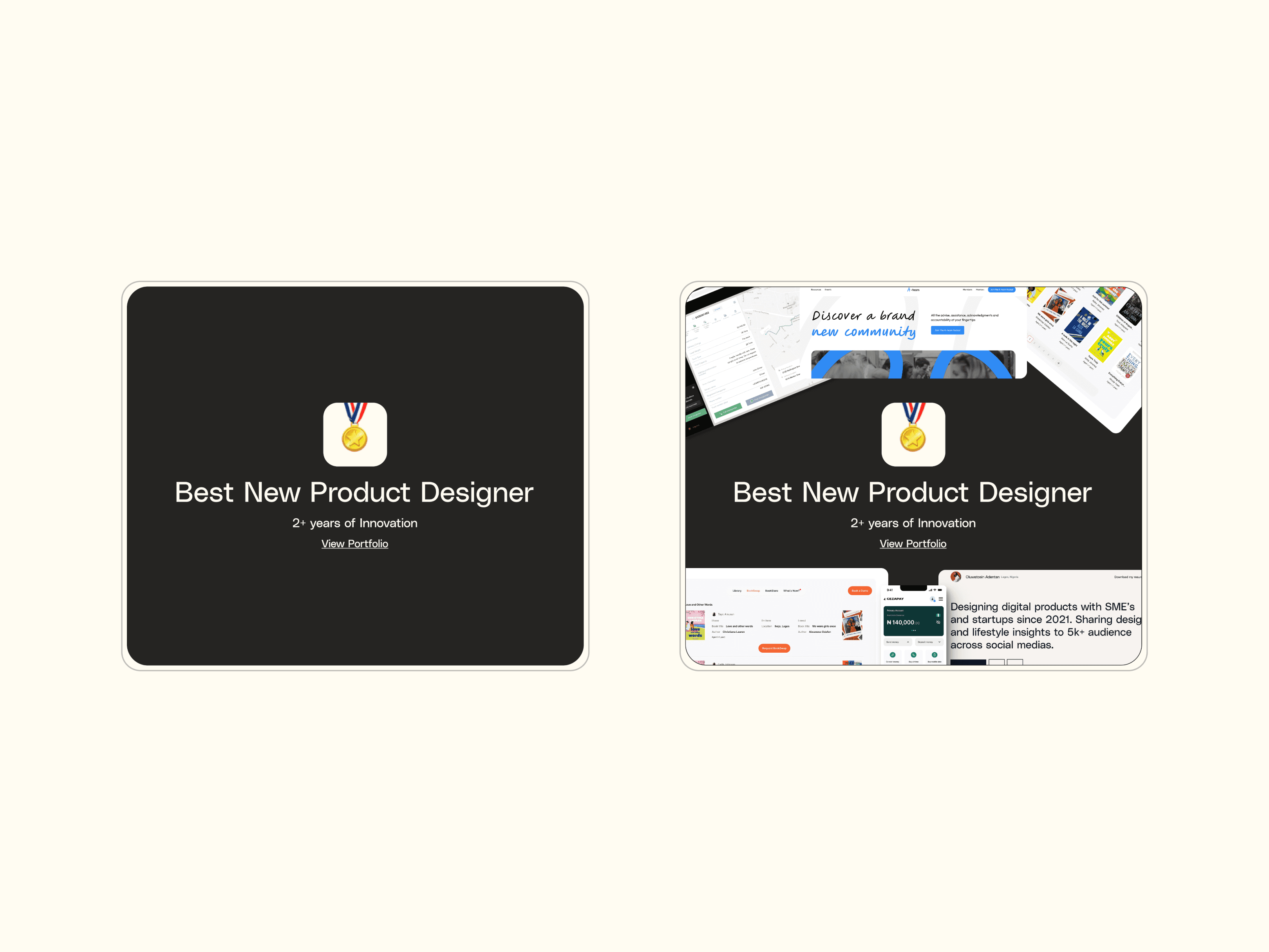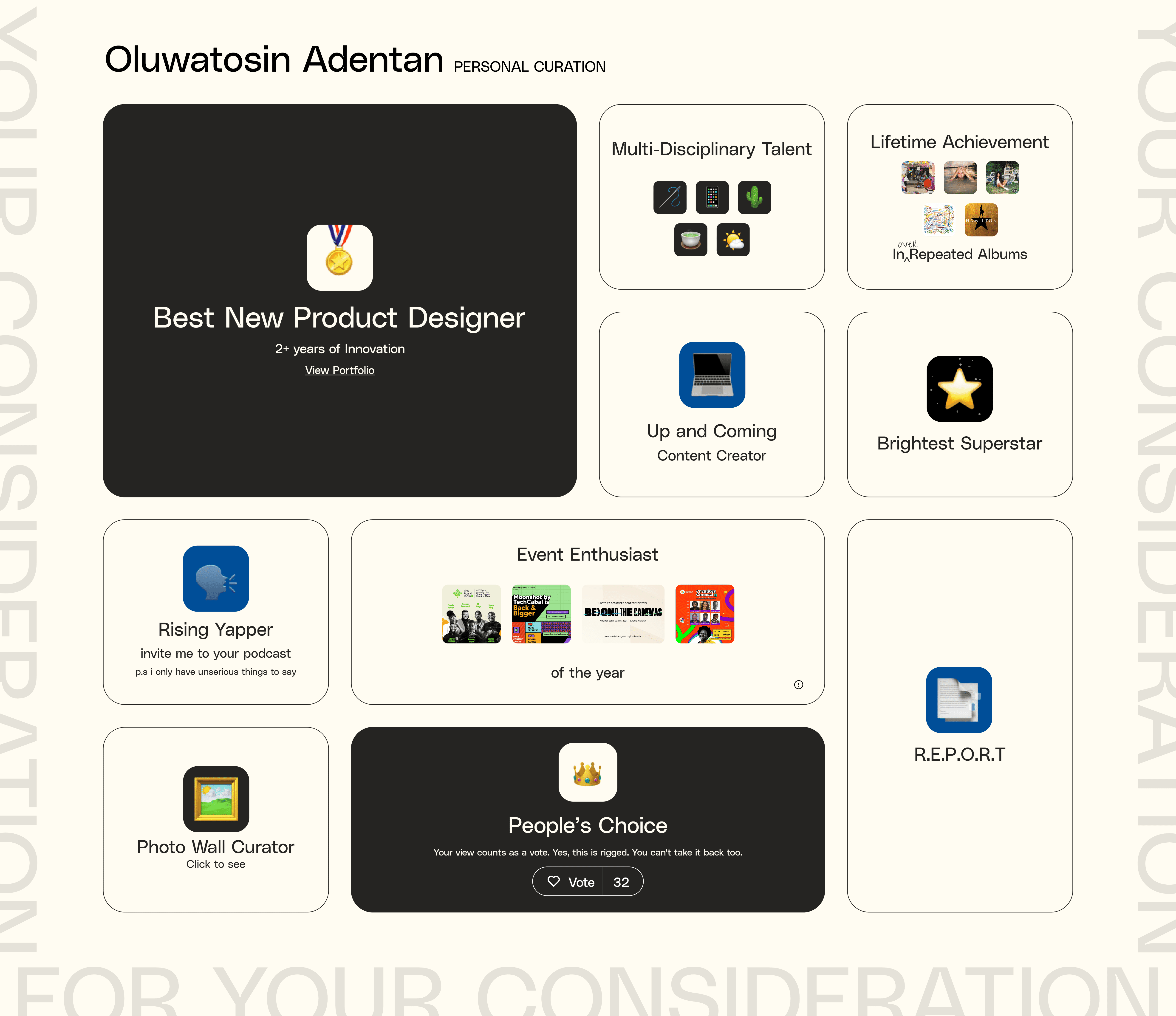 I still have much more explorations to carry out with this project but the basis was to convey something similar to what musicians and artistes submit during award season to be considered for awards. I wanted to reimagine that as a product designer and came up with this bento layout. Each frame has some sort of interaction to it so be sure to check out the live website built with Framer.